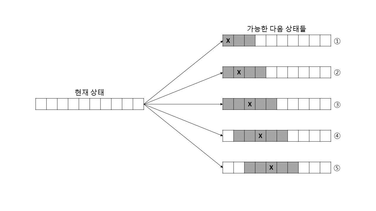 여기까지를 base case로 잡고 이제 다른 모든 n에 대해서 가능한 모든 다음 상태를 논할 수 있다. n == 10인 상황을 예로 들겠다.